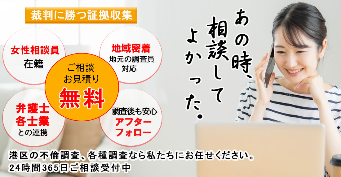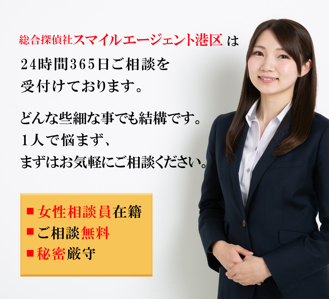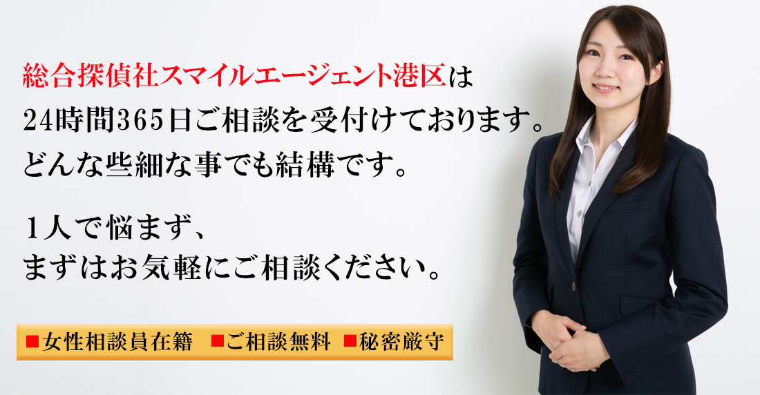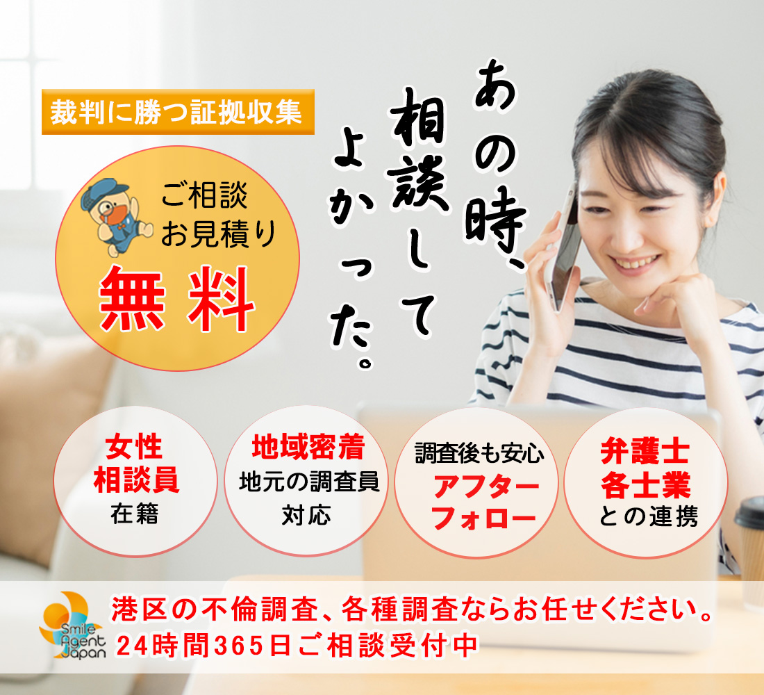 港区で不倫・浮気調査や行方調査、ペット捜索などの各種調査で探偵をお探しの際にはご相談・お見積りは無料となっておりますので一度、総合探偵社スマイルエージェント港区までお気軽にご相談ください。